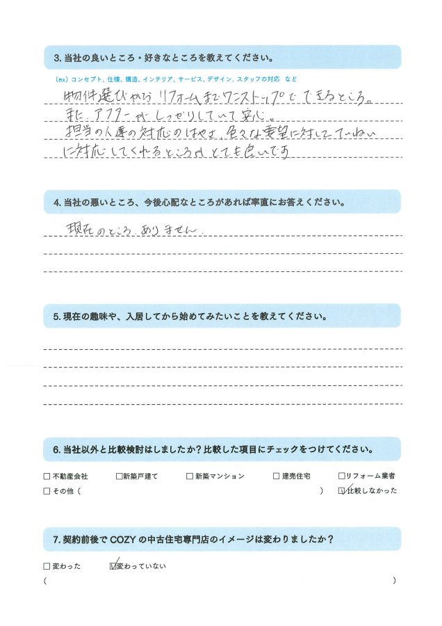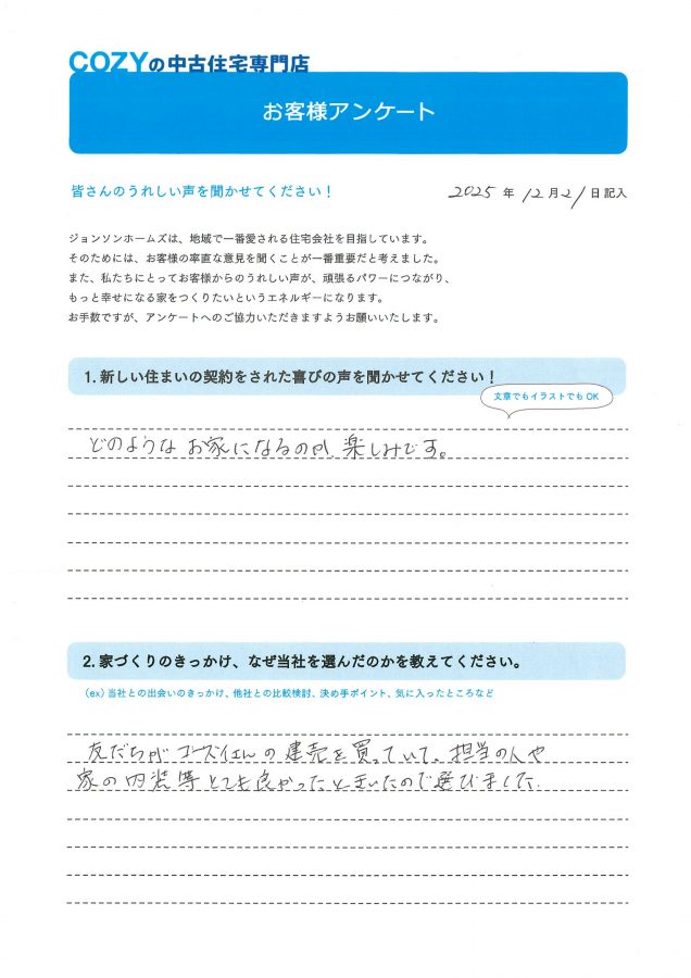 友だちがコーズィさんの建売を買っていて、担当の人や家の内装等とても良かったときいたので選びました。